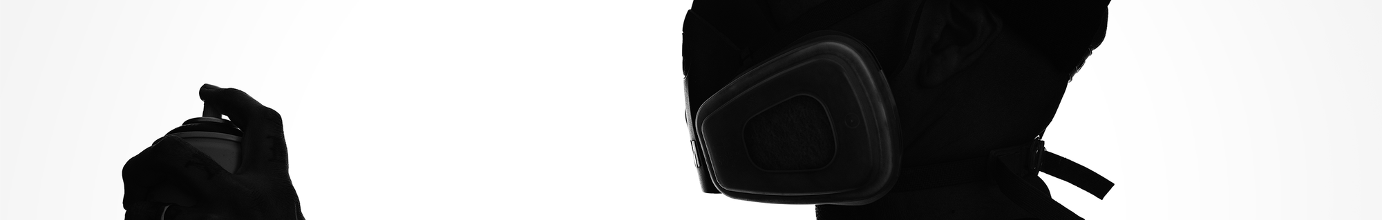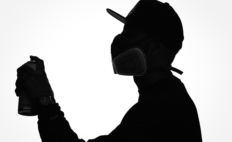 A header image for an interview with Damin Lujan.Black and white image of a person in profile wearing a respirator mask and holding a spray can.