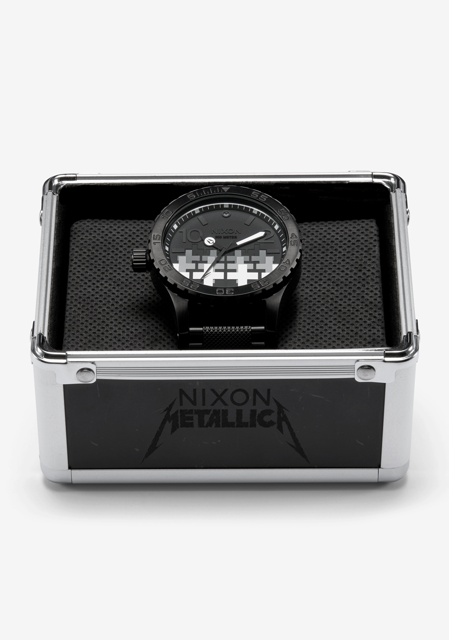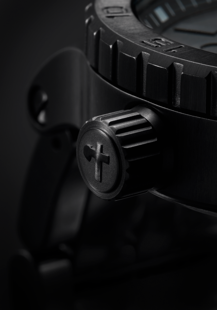 51mm custom solid stainless steel case with a 300 meter / 30 ATM water rating. Includes a unidirectional rotating bezel with countdown timer, hardened mineral crystal, screw down crown, stainless steel screw down caseback and screw pin lugs.