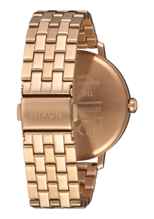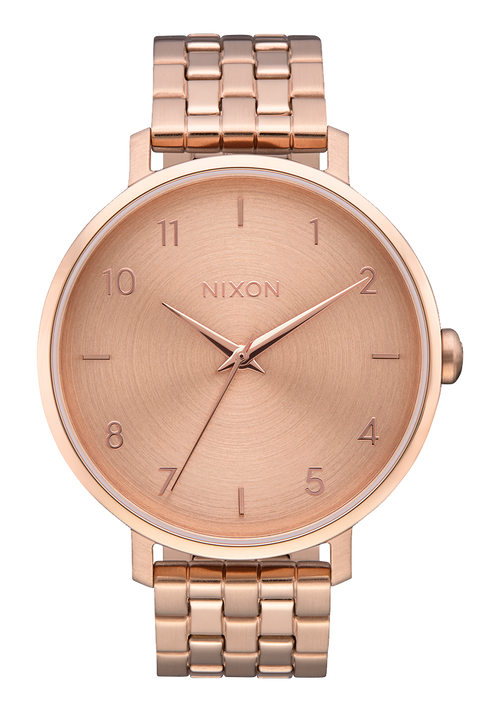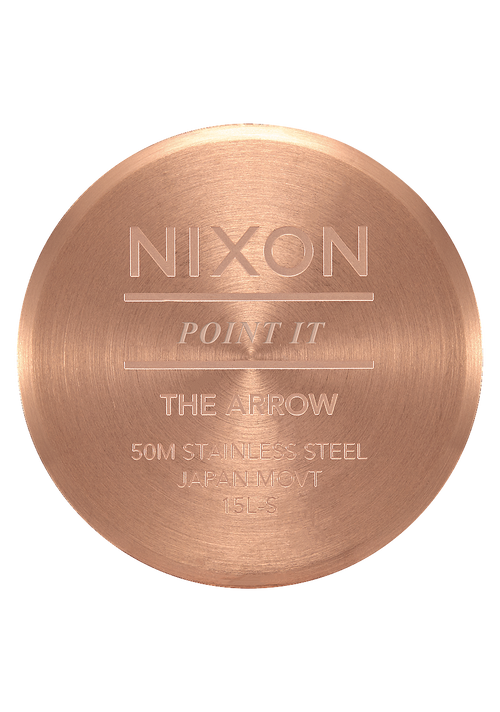 Dial features applied Nixon wordmark and hour markers in Arabic and stick format. Also features printed numbers and custom molded hands.