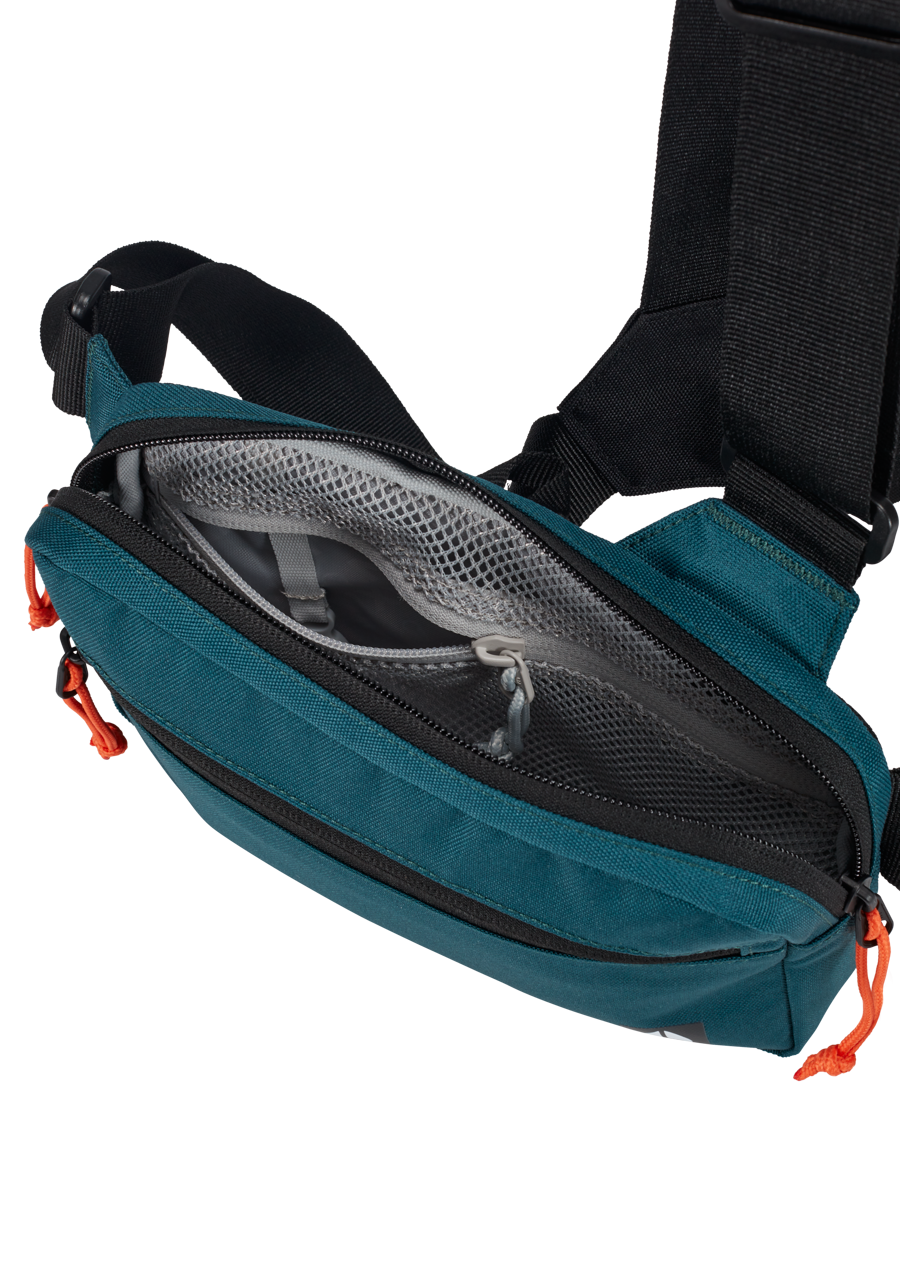 Breathable mesh back panel facilitates airflow and cuts down on sweat. Front-facing harness design adds style to the functionality and security of the Bandit. Internal and external zippered pockets and internal organizers like a key clip and slip pockets.