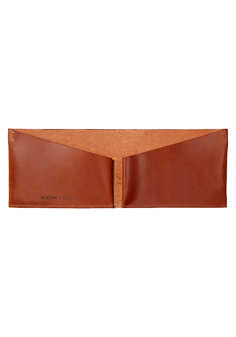 Putting the ""fold"" in billfold, the Cache is a single piece of Genuine Leather oragami'd to a sleek and stylish currency conveyance. Dual pockets carry your cards, and the bill sleeve can accommodate a variety of cash types. Debossed Nixon wordmark gives the Cache a little low-key flair.