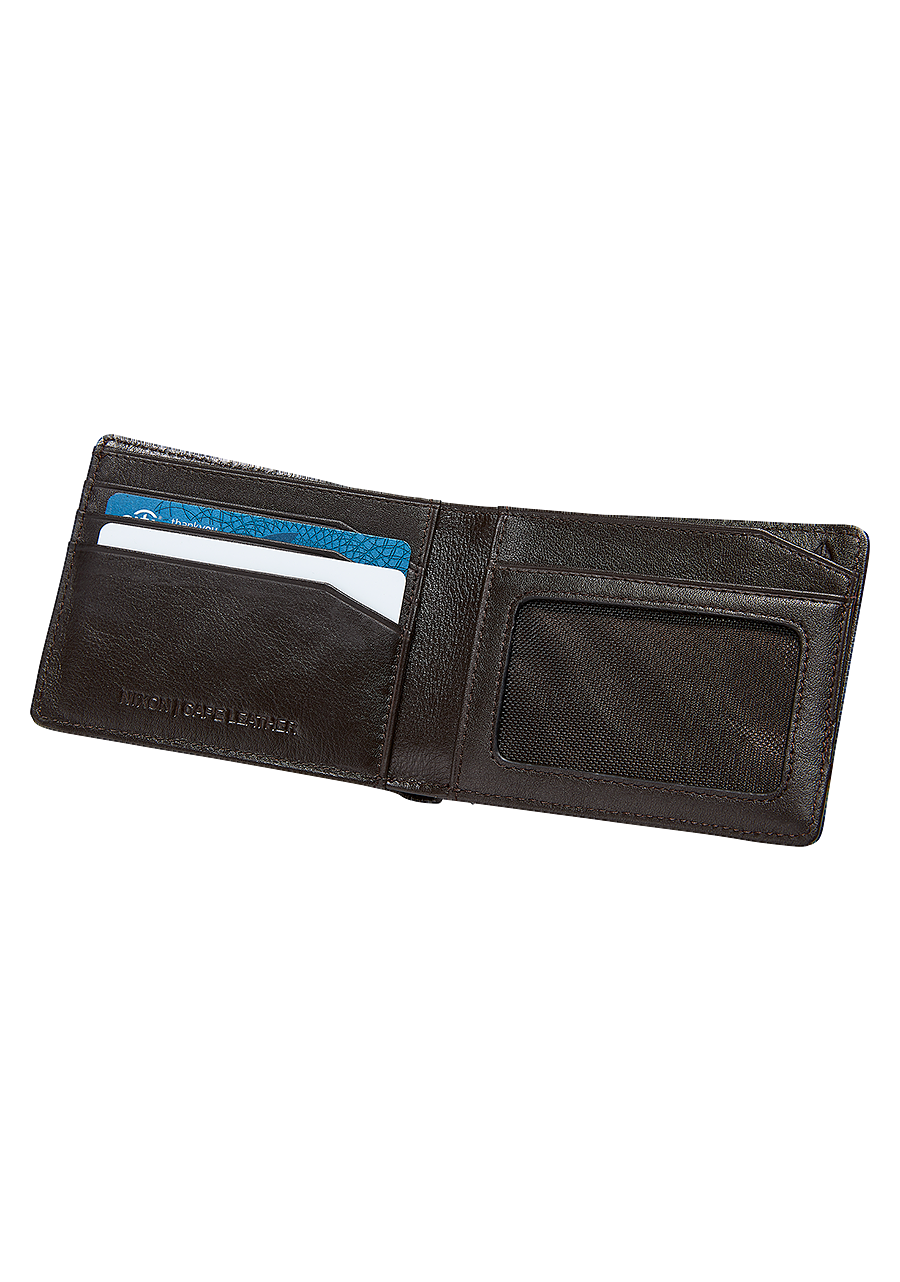 A 100% genuine leather wallet with embossed interior. Features easy access currency sleeve, mesh ID window, and custom metal logo rivet at front.