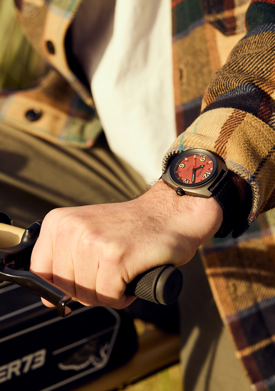 The Nixon Clutch 42 features a stainless steel case and an abrasion-resistant, quick-drying nylon band that makes it durable and comfortable. Its water resistance rating of 100 meters / 10 ATM and hardened mineral crystal window enhance its overall durability, making it suitable for both wet and dry environments.