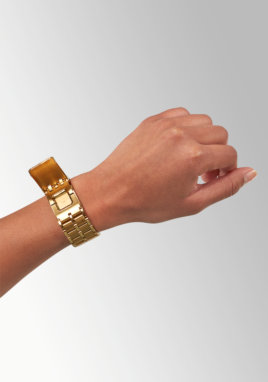 Woman wearing black leather jacket holds black leather bag with The Confidante watch in All Gold on wrist