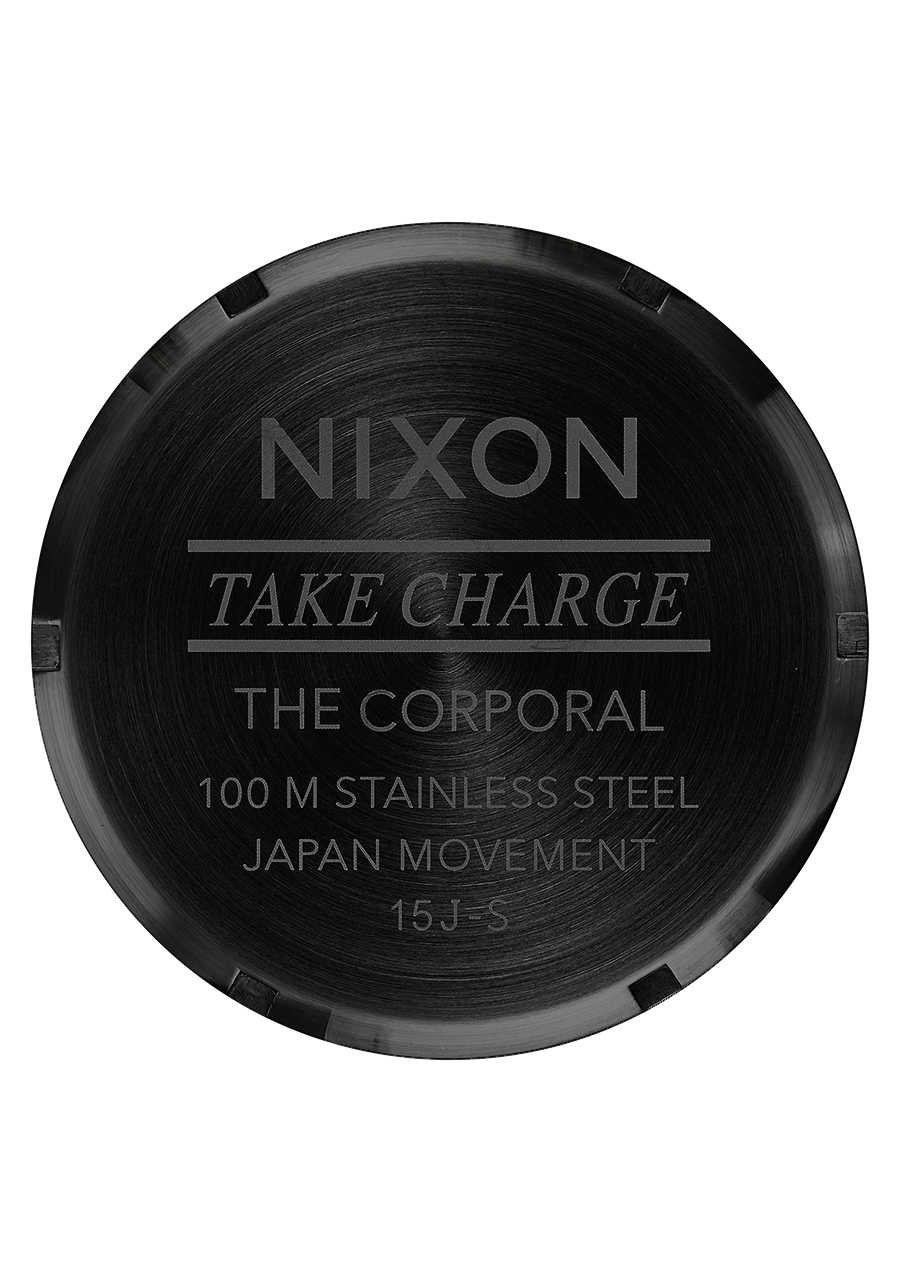 The Nixon Corporal features a 48mm custom solid stainless steel case, a solid stainless steel fixed bezel, and a hardened mineral crystal.