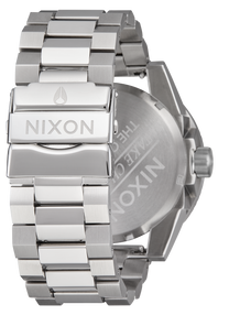 The Nixon Corporal features a 48mm custom solid stainless steel case, a solid stainless steel fixed bezel, and a hardened mineral crystal.