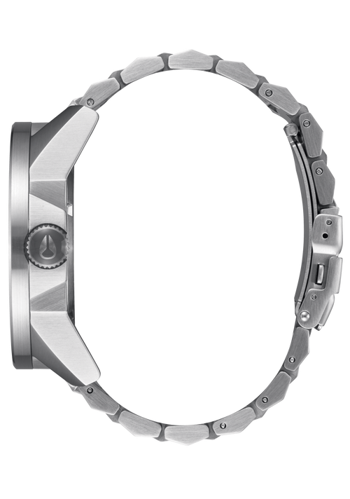 The Nixon Corporal features a 48mm custom solid stainless steel case, a solid stainless steel fixed bezel, and a hardened mineral crystal.