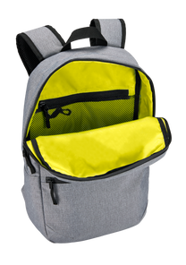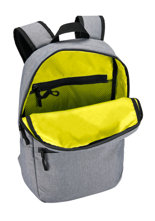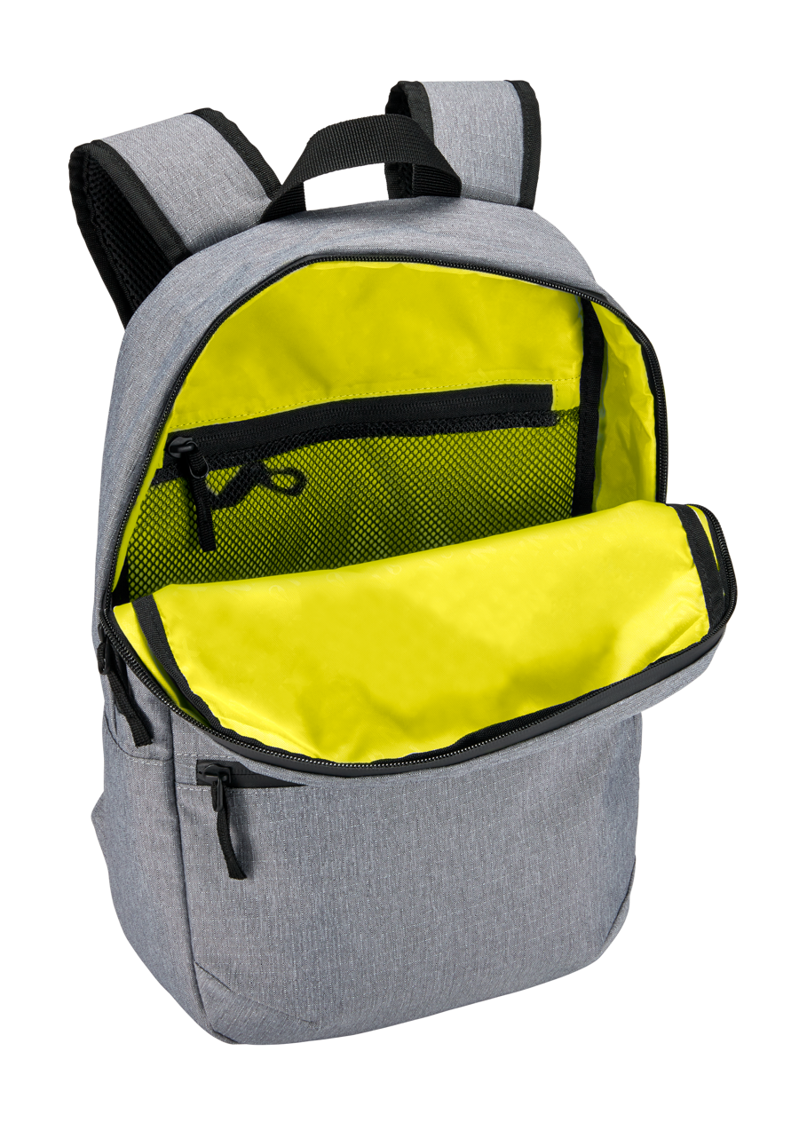 Padded air-mesh back and shoulder straps for comfort and ventilation. Mesh slip-pocket and zippered pocket with a key clip in the main compartment. Zippered front pocket. Weather-resistant coated exterior zippers.