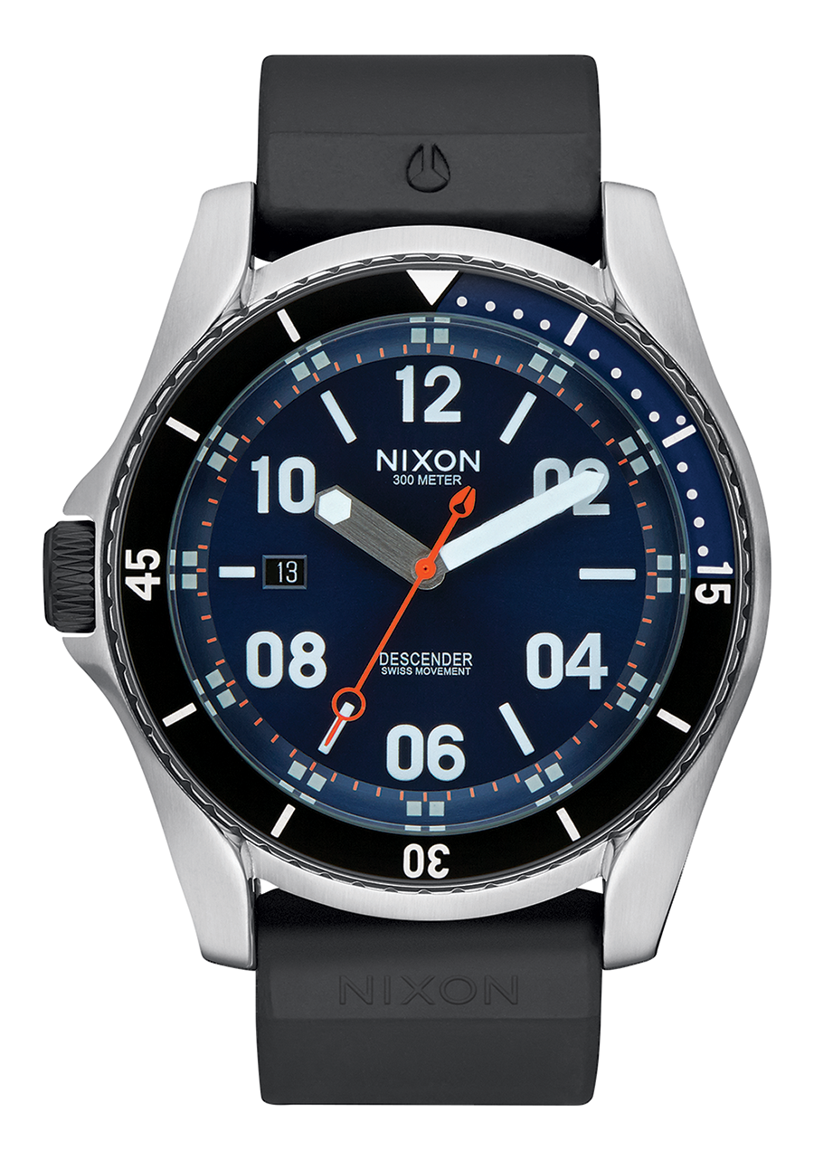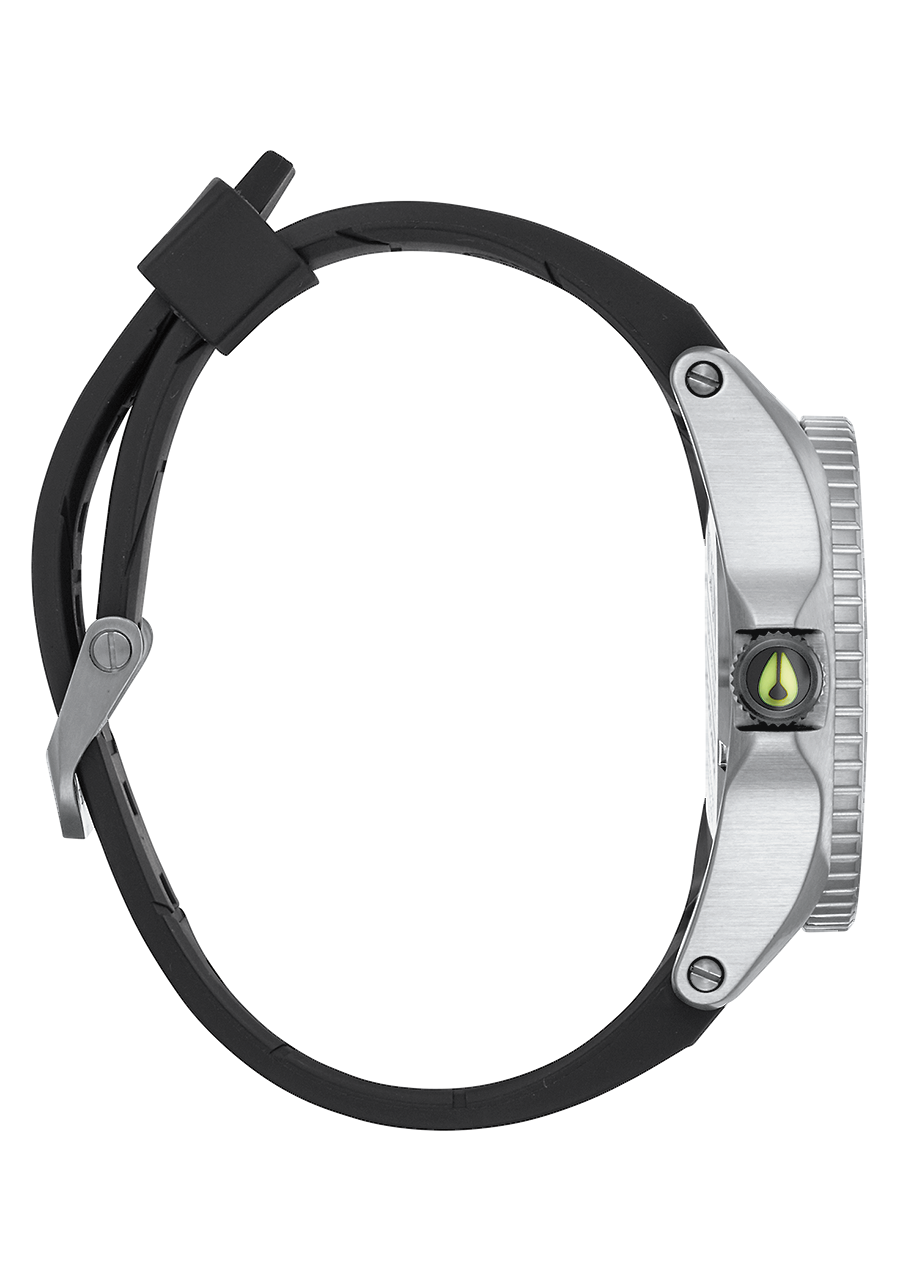 The shark tooth knurled crown is framed with the built-in crown protector. Crown is placed at 9 o’clock to prevent “wrist bite” during activities. Also features a unidirectional rotating bezel for an analog countdown timer.
