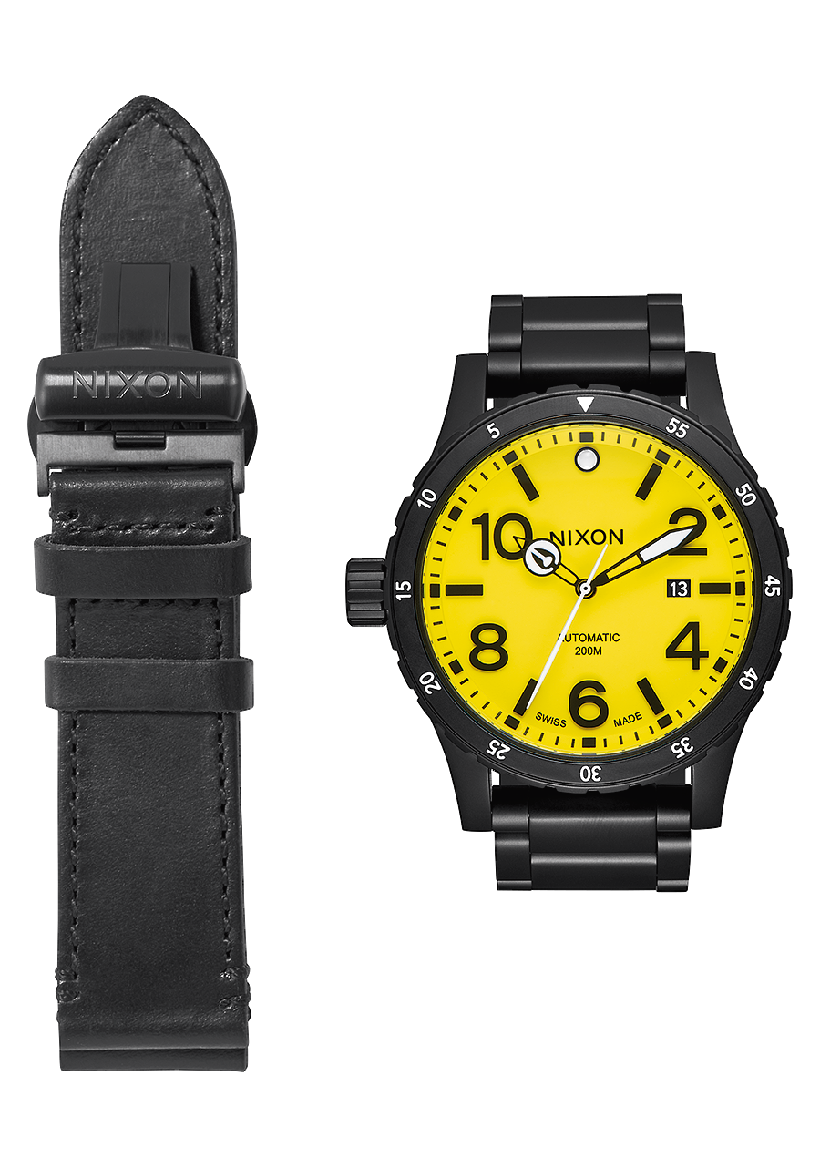 23mm custom solid stainless steel 3 link bracelet with 1.5mm hex head screw pins. enables 10mm of on-the-fly, quick-access, tool-free band adjustment. Double locking clasp closure. Alternate strap is Horween Aniline Chromexcel Black with Brushed SS deployant buckle.