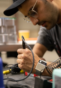 34mm custom injection molded stainless steel case with perforated stainless steel speaker cover and pushers, with micro USB charging port.