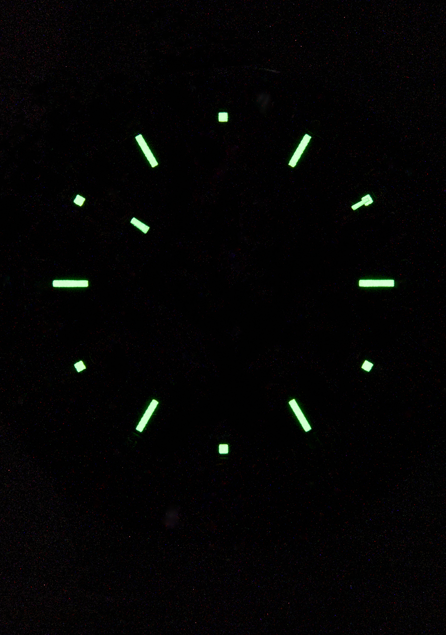 40mm custom solid stainless steel case and fixed bezel with a 100 meter / 10 ATM water rating. Includes a hardened mineral crystal, triple gasket stainless steel crown and stainless steel screw down caseback.