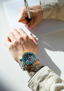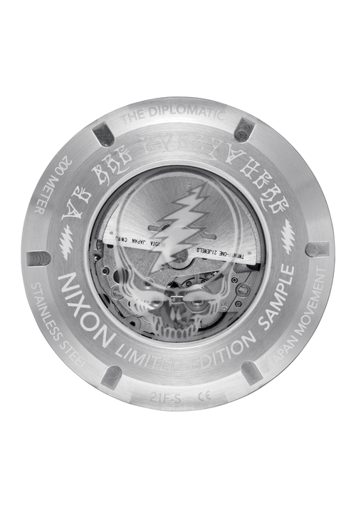 Grateful Dead details from the acetate inlay around the bezel matching the malachite gemstone 12 o'clock marker, down to the custom molded 13-point lightning bolt on the seconds hand as well as etched into the crown. The automatic movement is revealed through the crystal caseback featuring the Steal Your Face skull and a special Dead Head message around the edge. To top things off, a keepsake enamel pin comes with this premium package.