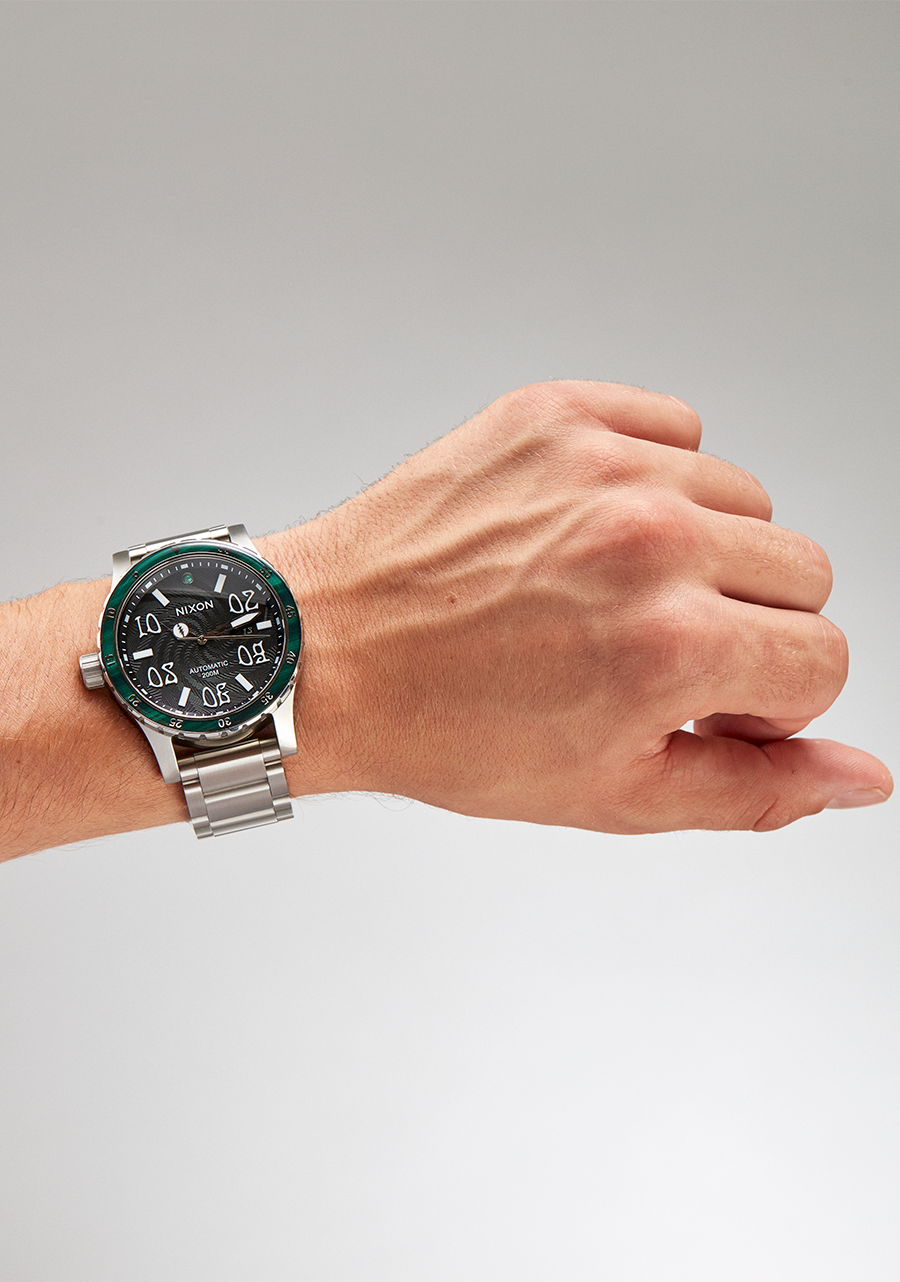 Miyota 8215 Japanese automatic movement, sweeping seconds hand and custom engraved movement rotor point to some of the finer touches on the Diplomatic. They also point to applied numbers and indices on dial & ring featuring a printed seconds track on the unidrectional rotating bezel. Pro-level percsion with a 200m / 20 ATM water rating to prove it.