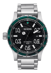 46mm, 200 meter/20 ATM custom solid stainless steel case with unidirectional rotating stainless steel bezel. Acetate bezel insert with SS countdown timer markings. Domed sapphire crystal with anti-glare coating on underside. Triple gasket stainless steel screw down crown at 9 o'clock. Stainless steel screw down caseback with exhibition crystal with custom etch pattern showing custom engraved movement rotor. Stainless steel, 2mm hex head screw bars. Individually serialized number engraved on caseback.