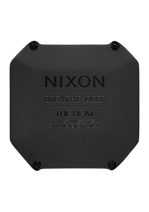 The Nixon Heat features a 38mm custom ultra-thin 8mm stainless steel case with stainless steel pushers and a hardened mineral crystal for protection. The band is a 20mm injection molded rubber strap with a perforated design, engineered for durability, breathability, and comfort. The watch is designed for maximum performance in sports, offering robust protection against impacts and water resistance up to 100 meters / 10 ATM.