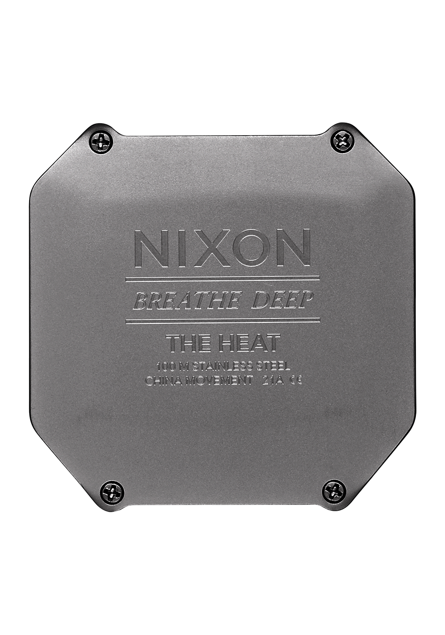 The Nixon Heat features a 38mm custom ultra-thin 8mm stainless steel case with stainless steel pushers and a hardened mineral crystal for protection. The band is a 20mm injection molded rubber strap with a perforated design, engineered for durability, breathability, and comfort. The watch is designed for maximum performance in sports, offering robust protection against impacts and water resistance up to 100 meters / 10 ATM.
