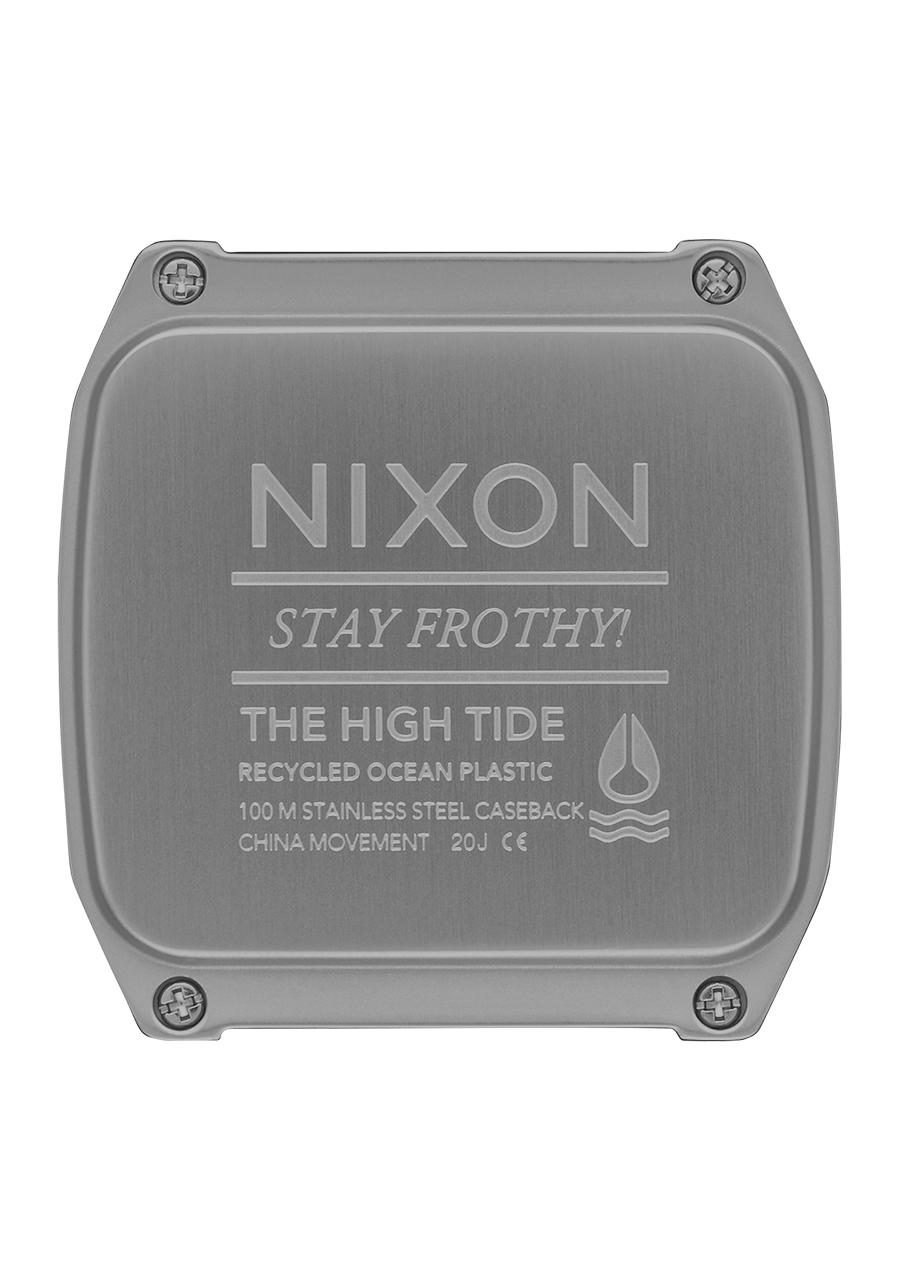The Nixon High Tide watch features a case reinforced by injection molding and a stainless steel bezel for added protection. The strap is made from a durable rubber blend. The High Tide incorporates recycled ocean plastics into the case, which are processed to restore the original integrity of the plastic, making these watches eco-friendly.