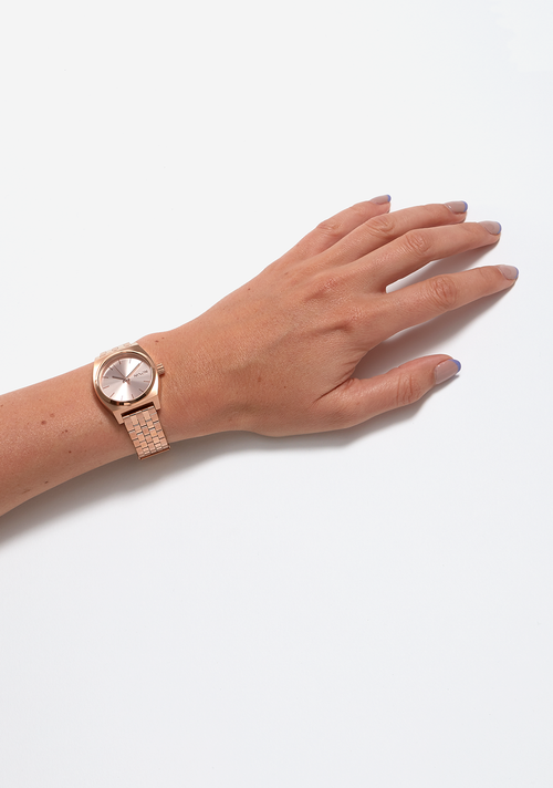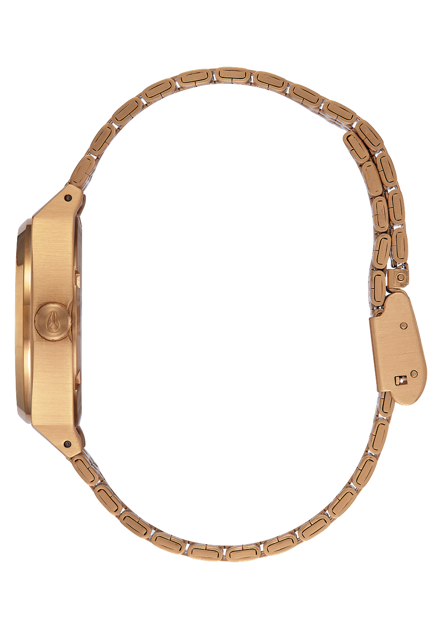 To adjust the stainless steel bracelet of the Medium Time Teller for a secure fit, you can use the sliding adjustment buckle to tighten or loosen the band. This involves sliding the buckle along the band to the desired position. A tool to begin this adjustment is included in the watch box. For more information visit the Nixon blog.