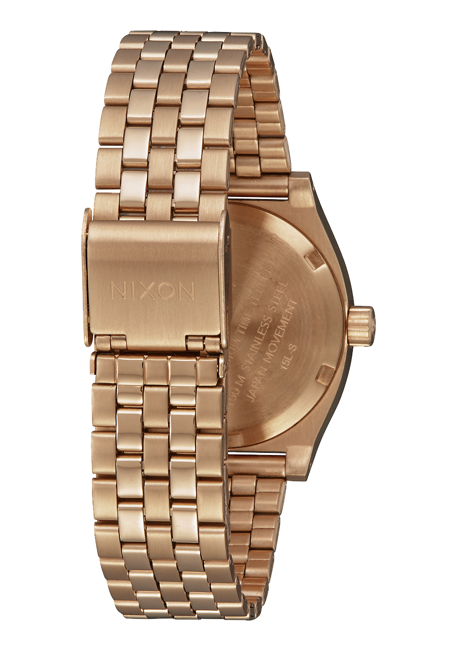 To adjust the stainless steel bracelet of the Medium Time Teller for a secure fit, you can use the sliding adjustment buckle to tighten or loosen the band. This involves sliding the buckle along the band to the desired position. A tool to begin this adjustment is included in the watch box. For more information visit the Nixon blog.