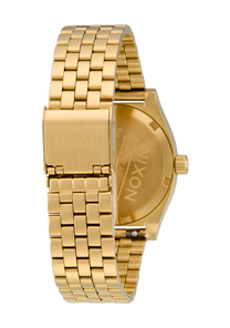 To adjust the stainless steel bracelet of the Medium Time Teller for a secure fit, you can use the sliding adjustment buckle to tighten or loosen the band. This involves sliding the buckle along the band to the desired position. A tool to begin this adjustment is included in the watch box. For more information visit the Nixon blog.