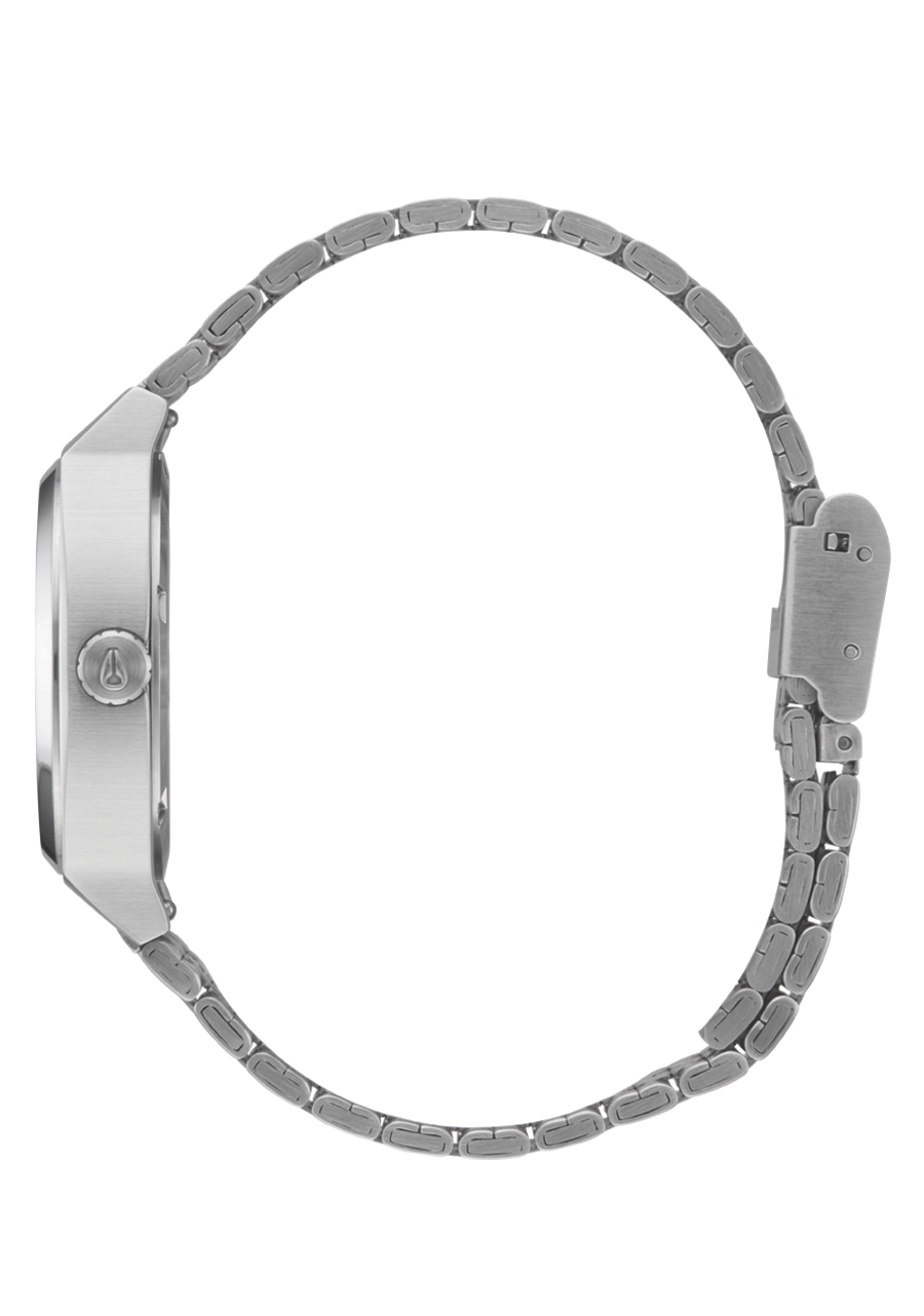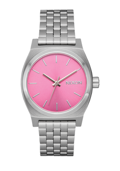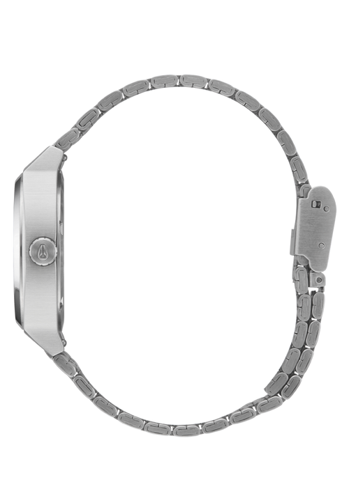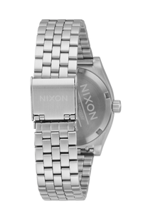 To adjust the stainless steel bracelet of the Medium Time Teller for a secure fit, you can use the sliding adjustment buckle to tighten or loosen the band. This involves sliding the buckle along the band to the desired position. A tool to begin this adjustment is included in the watch box. For more information visit the Nixon blog.