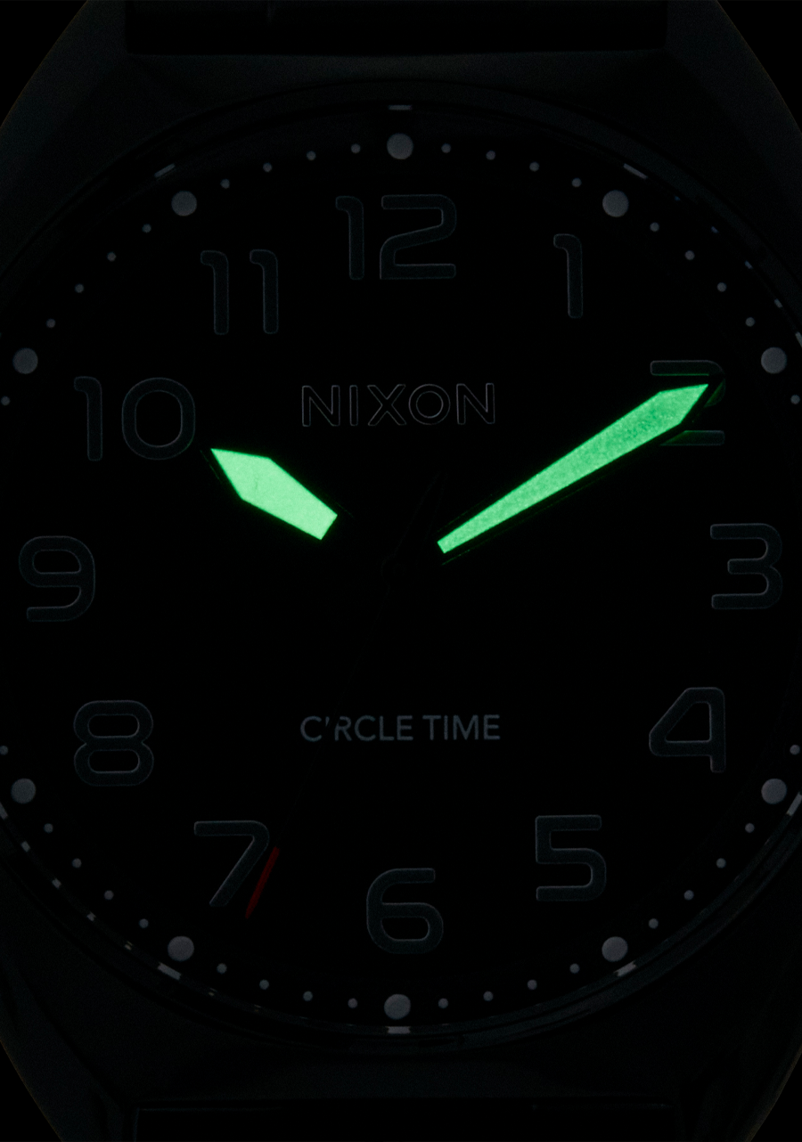 Taking it a step further, the silicone watch band features a locking looper for extra security and quick-release so you can swap bands instantly. The 10 ATM / 100m water rating means a pre-work surf is no problem. Plus, luminescent hands keep the party going with night visibility.