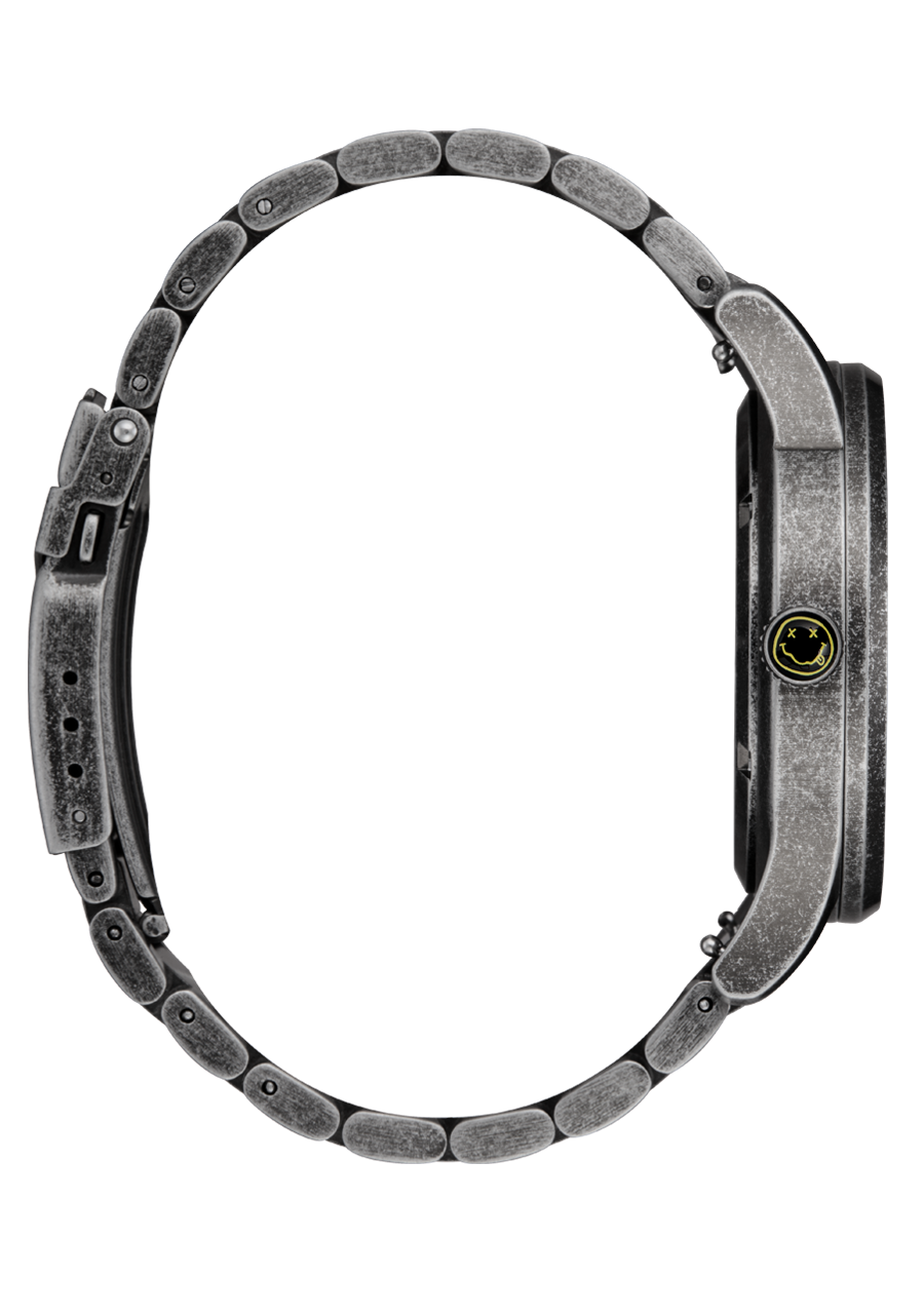 A unique "wobble" case design that matches the curvature of Nirvana's famous hand-drawn smiley face graphic on the dial.