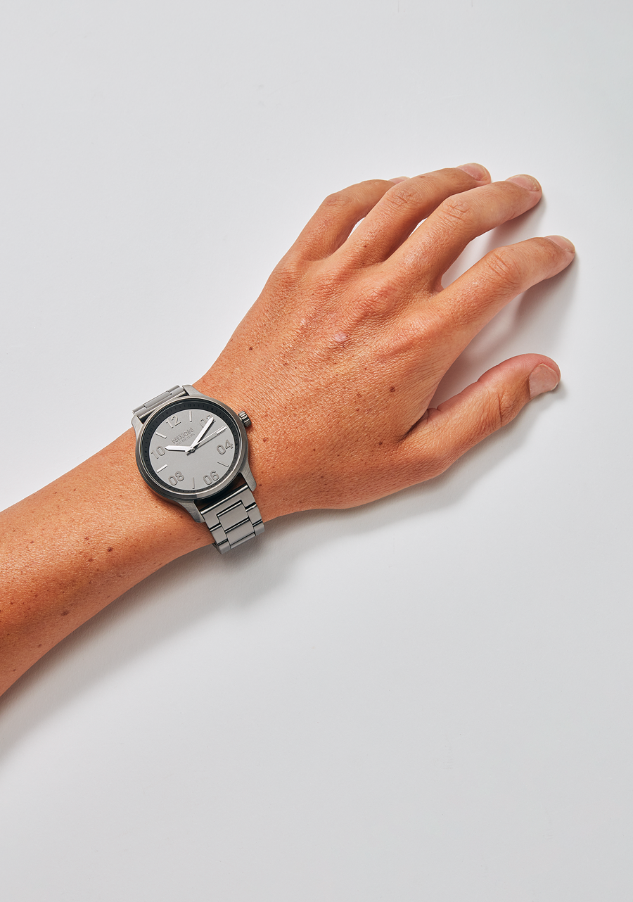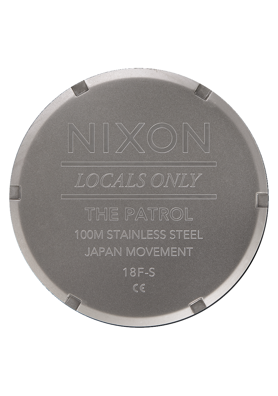 The Nixon Patrol features a 42mm custom solid stainless steel case, with a hardened mineral crystal and stainless steel screw down caseback. The stainless steel 3-link bracelet and included hardware are also made of stainless steel.