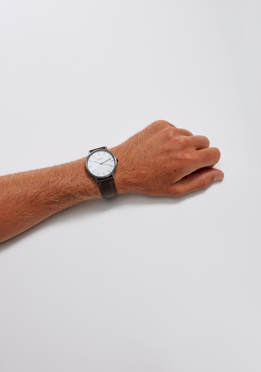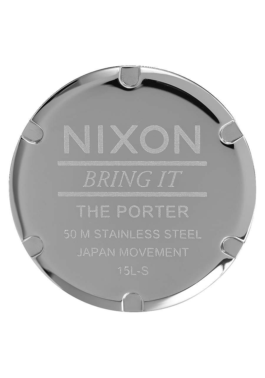 The case of the Nixon Porter Leather is made from custom stainless steel, while the strap is made from leather. To care for the leather band, first wipe away any dust with a dry microfiber cloth. Then get the cloth slightly damp and gently wipe away any dirt from the strap. Finally, let the strap air dry. For more information on cleaning leather watch straps, visit our blog.