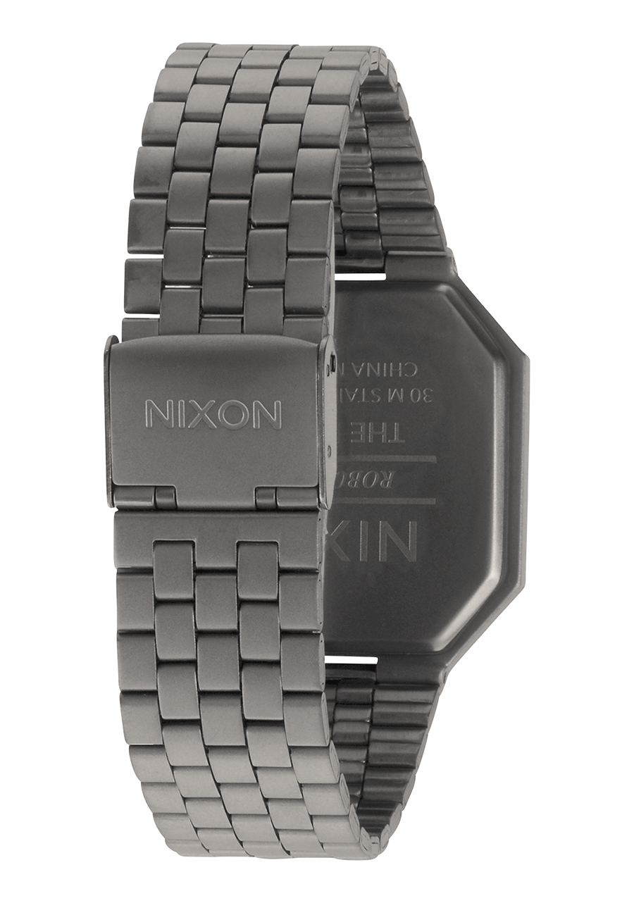 The Nixon Re-Run watch features a case made of solid stainless steel and hardened mineral crystal, providing durability for daily wear. The band is a 5-link stainless steel jewelry-style bracelet with a stainless steel locking clasp, ensuring a secure fit. The watch is designed to be durable enough for active wearers, with features like injection-molded polyurethane pushers to enhance its throwback design and functionality.