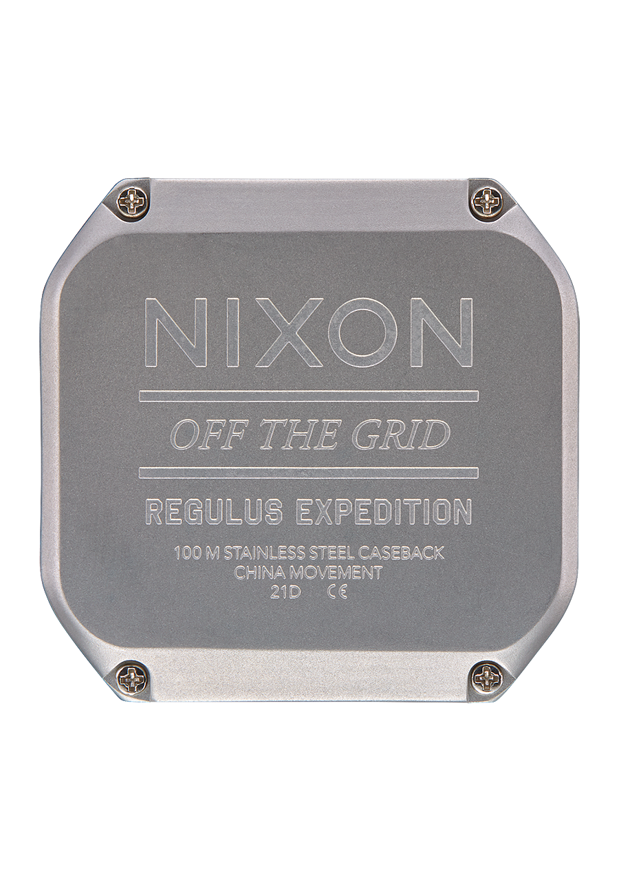 The Regulus Expedition watch is constructed with an injection-molded TR-90 case, which is ultra-durable and lightweight, combined with an integrated stainless steel bezel. The caseback is solid stainless steel and screw down, providing additional protection. It ships with a silicone strap with a locking looper and a double-prong buckle for security. It is designed to withstand rugged use, with a 100 meter / 10 ATM water rating and is engineered for off-the-grid adventures.