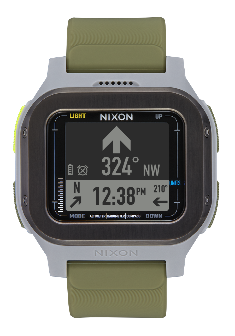 Custom digital module with high resolution MLCD with front light. Functions include altimeter, barometer, compass, thermometer. Camp mode with weather alert, session mode with runs tracker, dual time zones in 12 or 24 hr format, date, chronograph, and alarm.