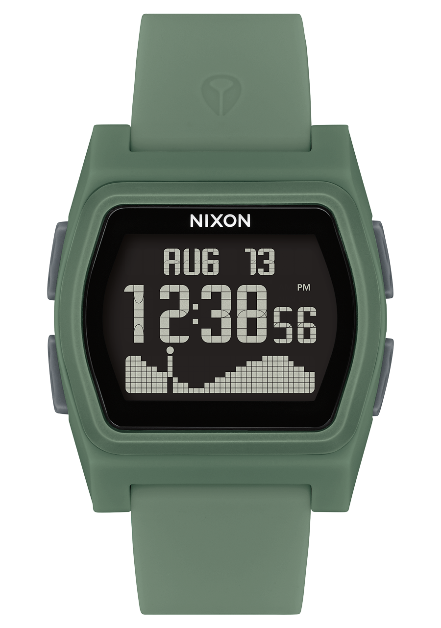 Custom digital module with pre-programmed tide information for 550 beaches around the world. Functions include time of day (12 hour or 24 hour), date, sunrise / sunset data, future and past tide, dual time, 3 types of alarms, countdown timer, wave counter, chronograph and an EL backlight.