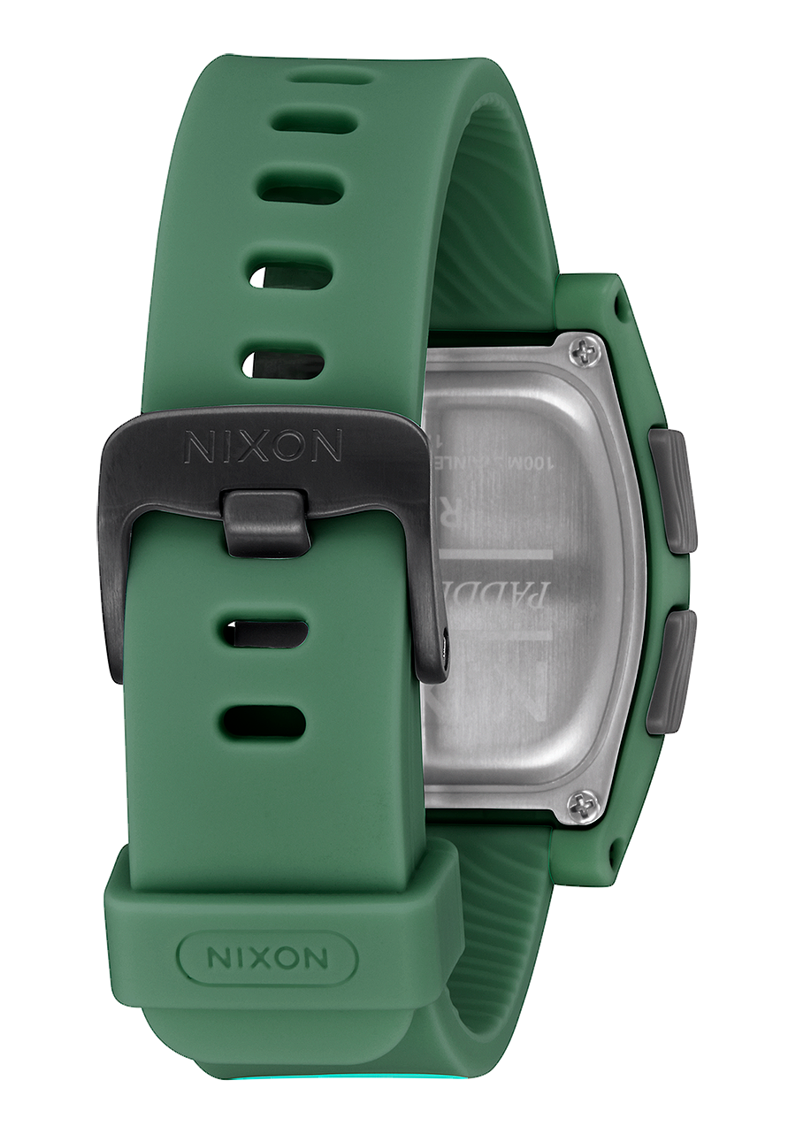 38mm, 100 meter/10 ATM custom reinforced recycled ocean plastics case with hardened mineral crystal, custom water resistant pushers, stainless steel screw down case back.