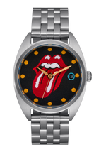 Dial features applied indices and custom molded hands. Features the classic Rolling Stones Tongue, gold orbiting indices and a blue-highlighted date window.