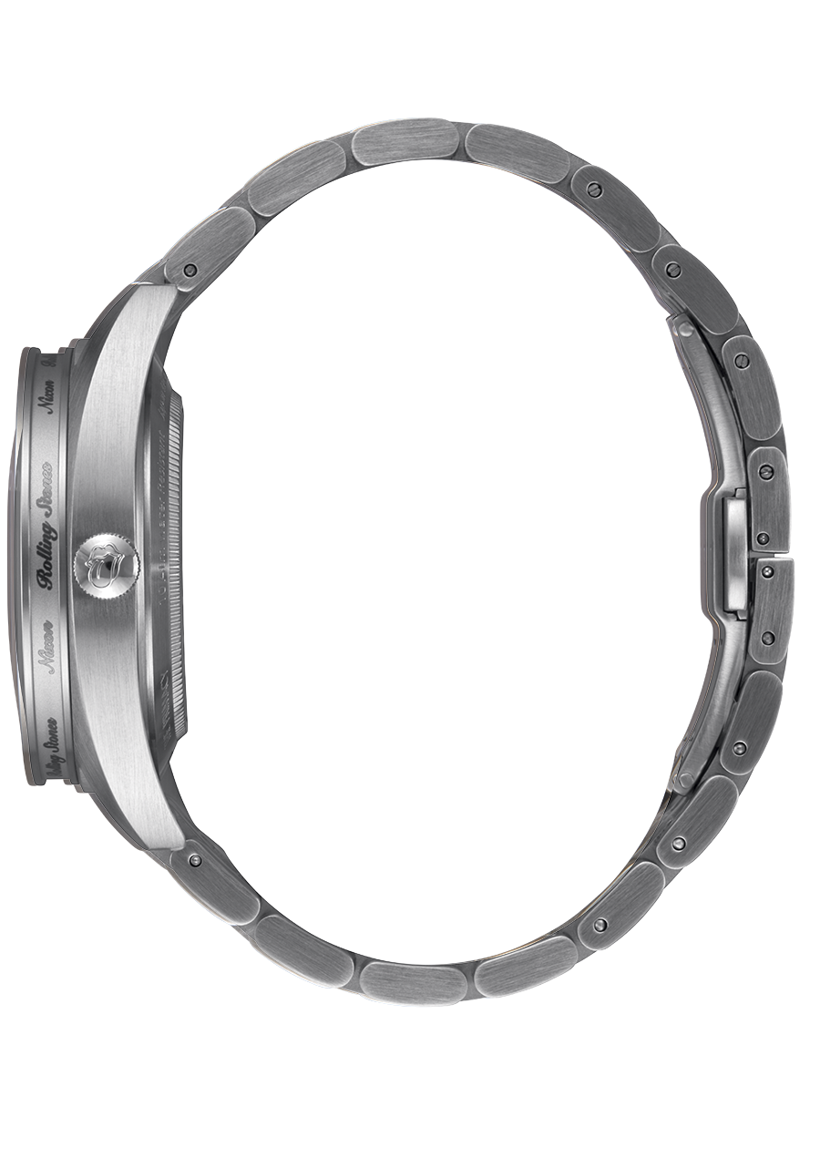 40mm custom solid stainless steel case with scratch resistant coating and a 100 meter / 10 ATM water rating. Includes sidewall engraving on the fixed bezel, triple gasket crown with knurling texture detail and a domed sapphire crystal with antiglare treatment on the underside of the crystal. Watches are individually numbered on the stainless steel screw down caseback with hardened mineral crystal window and spring pin lugs.
