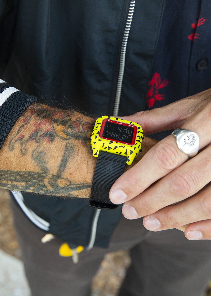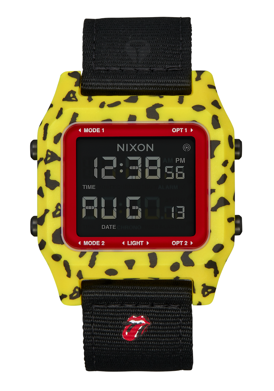 A yellow voodoo case inspired by Stones album artwork, while dual Nixon and Stones logos adorn the performance-based band. Functions include time of day, day/date with auto calendar through 2099, chronograph with 1/100 second resolution, timer, alarm and EL backlight. Display layout allows for any two functions to be displayed simultaneously.