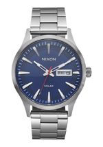 Semi-transparent dial features applied stainless steel stick indices, Nixon wordmark and date window. It also comes with an up-printed seconds track and custom lume-tipped steel skeleton hands.