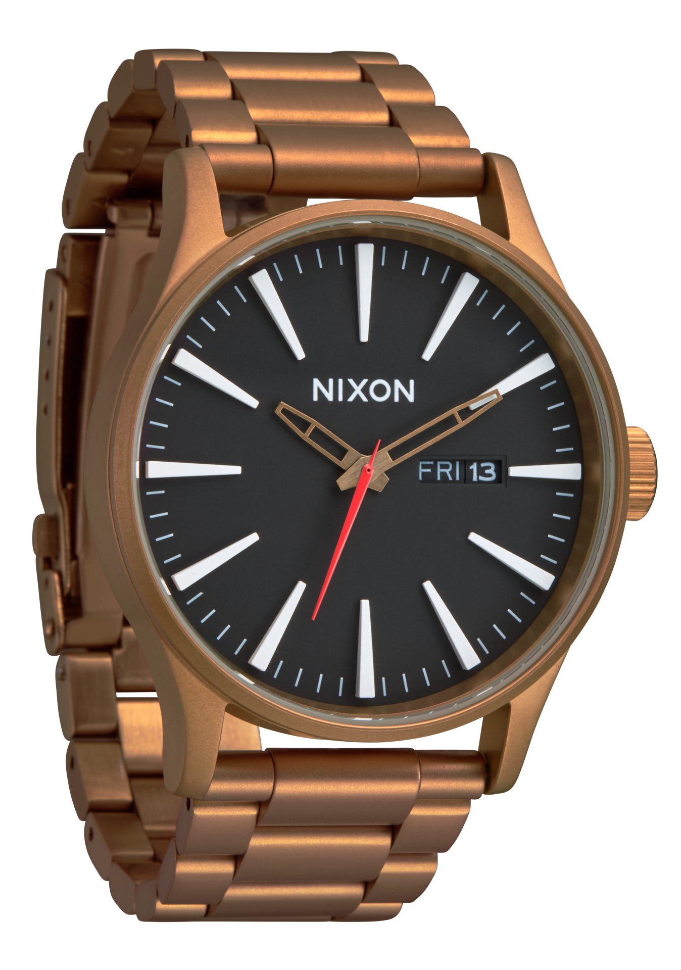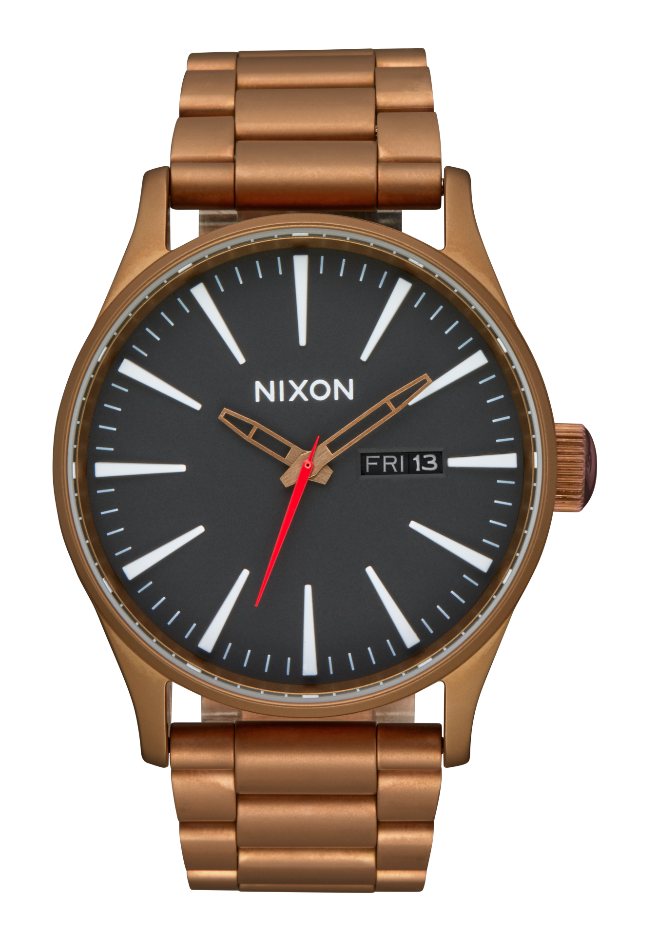 The Nixon Sentry Stainless Steel watch uses a Japanese Miyota 2305 quartz 3-hand movement and features a bilingual day and date function in English and Spanish.
