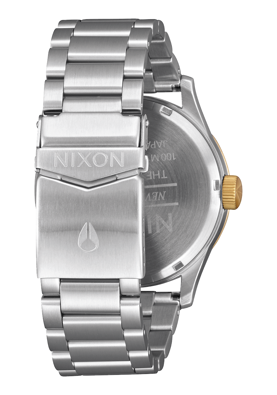 The Nixon Sentry Stainless Steel watch uses a Japanese Miyota 2305 quartz 3-hand movement and features a bilingual day and date function in English and Spanish.