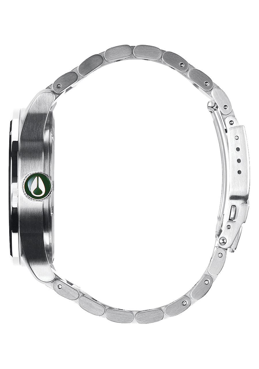 The Nixon Sentry Stainless Steel watch uses a Japanese Miyota 2305 quartz 3-hand movement and features a bilingual day and date function in English and Spanish.