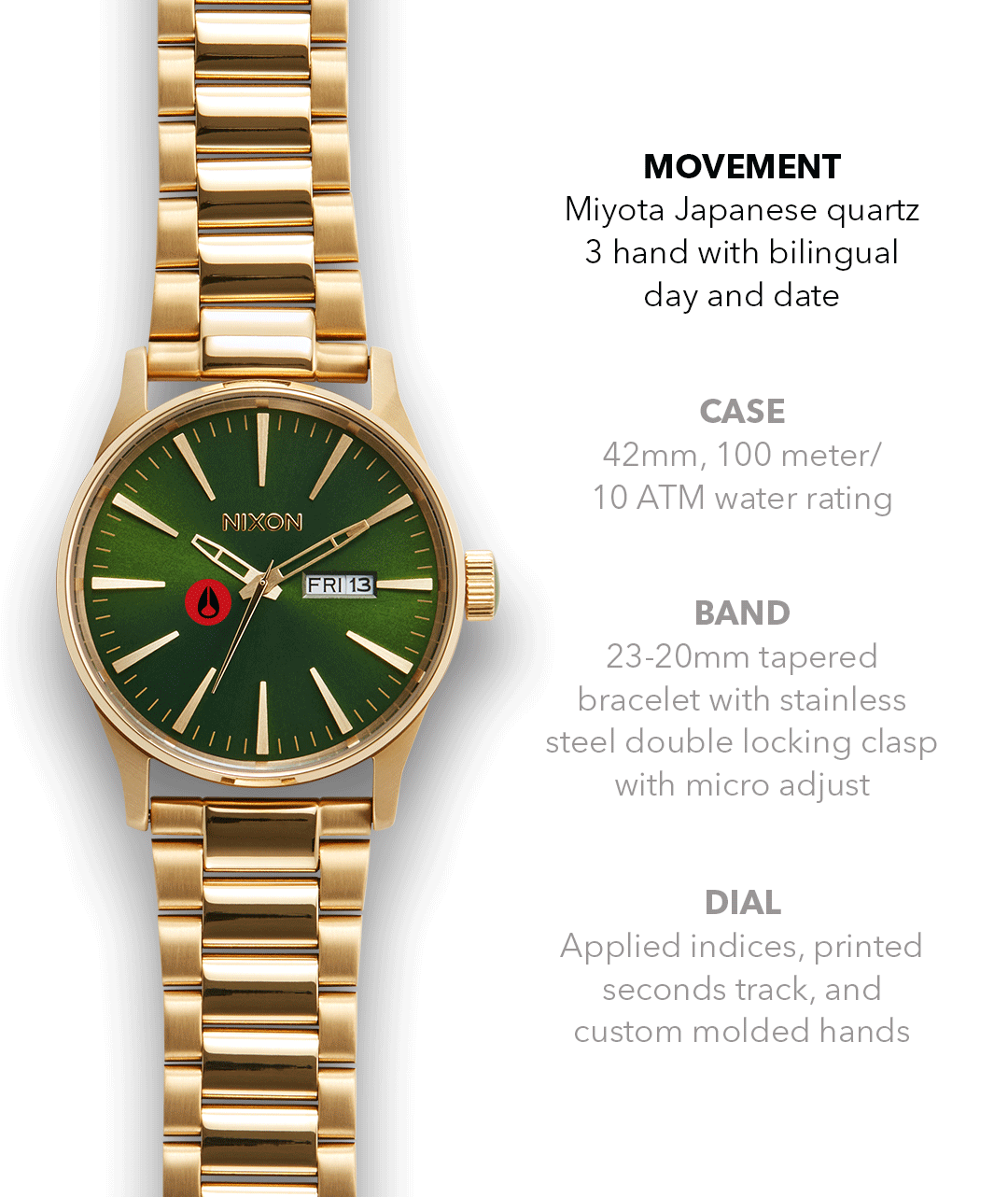 The Nixon Sentry Stainless Steel watch uses a Japanese Miyota 2305 quartz 3-hand movement and features a bilingual day and date function in English and Spanish.