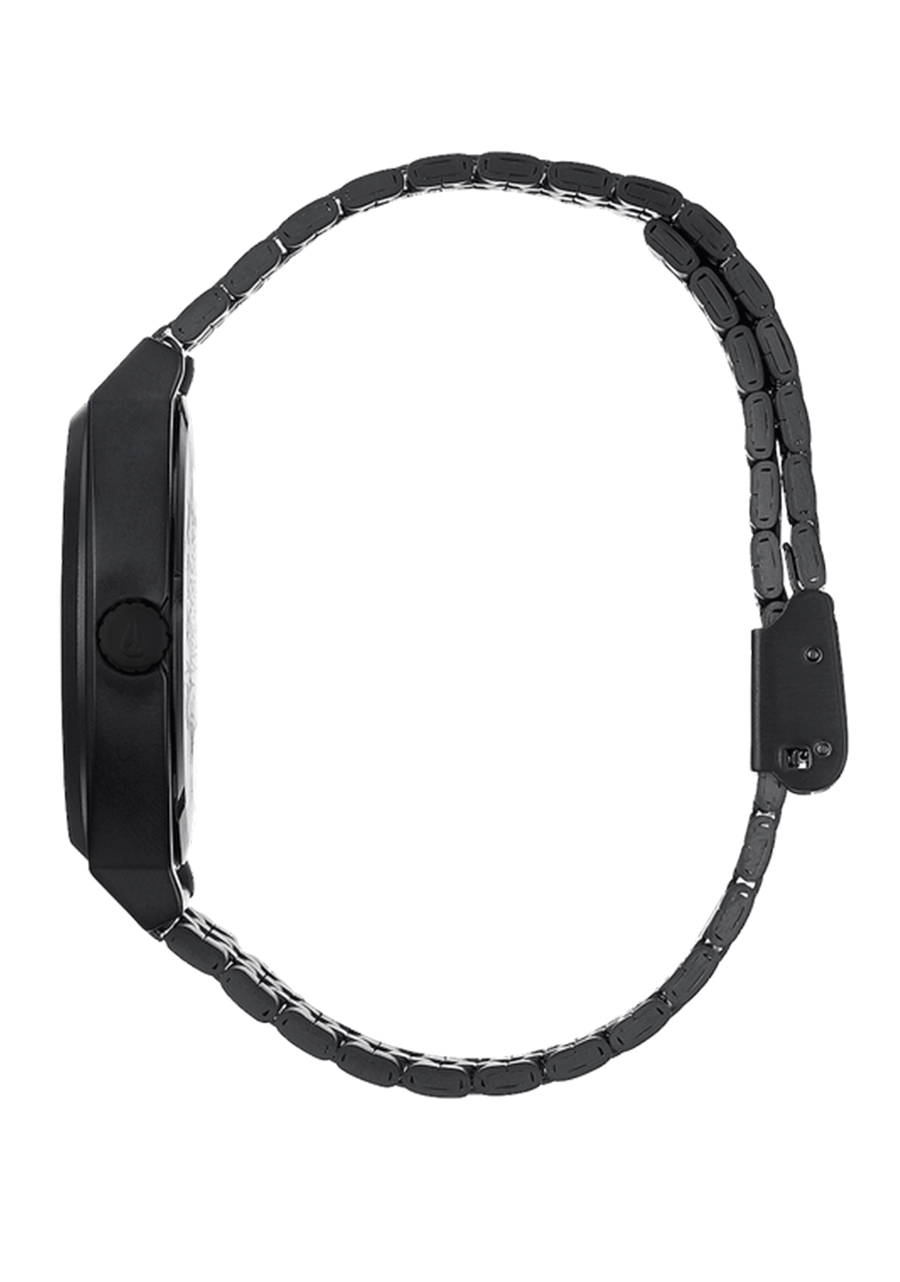 The Nixon Time Teller watch features a solid stainless steel case and a stainless steel bracelet, making it durable for daily wear and a hardened mineral crystal for added protection. The stainless steel case and bracelet provide protection against daily wear and tear, ensuring longevity and reliability.