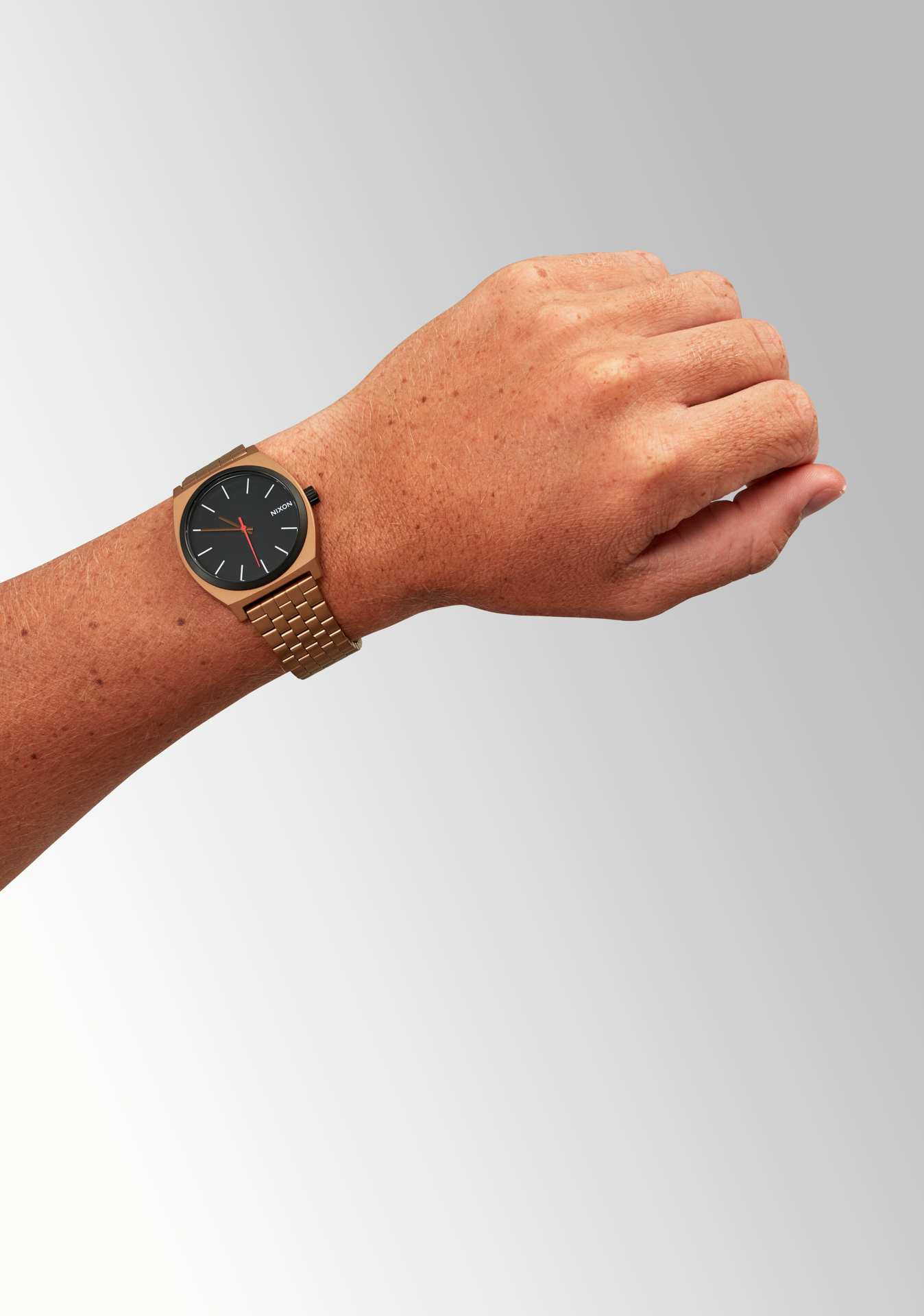 The Nixon Time Teller watch features a solid stainless steel case and a stainless steel bracelet, making it durable for daily wear and a hardened mineral crystal for added protection. The stainless steel case and bracelet provide protection against daily wear and tear, ensuring longevity and reliability.