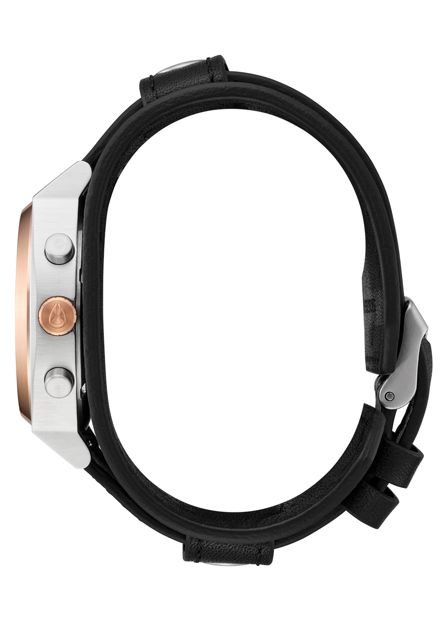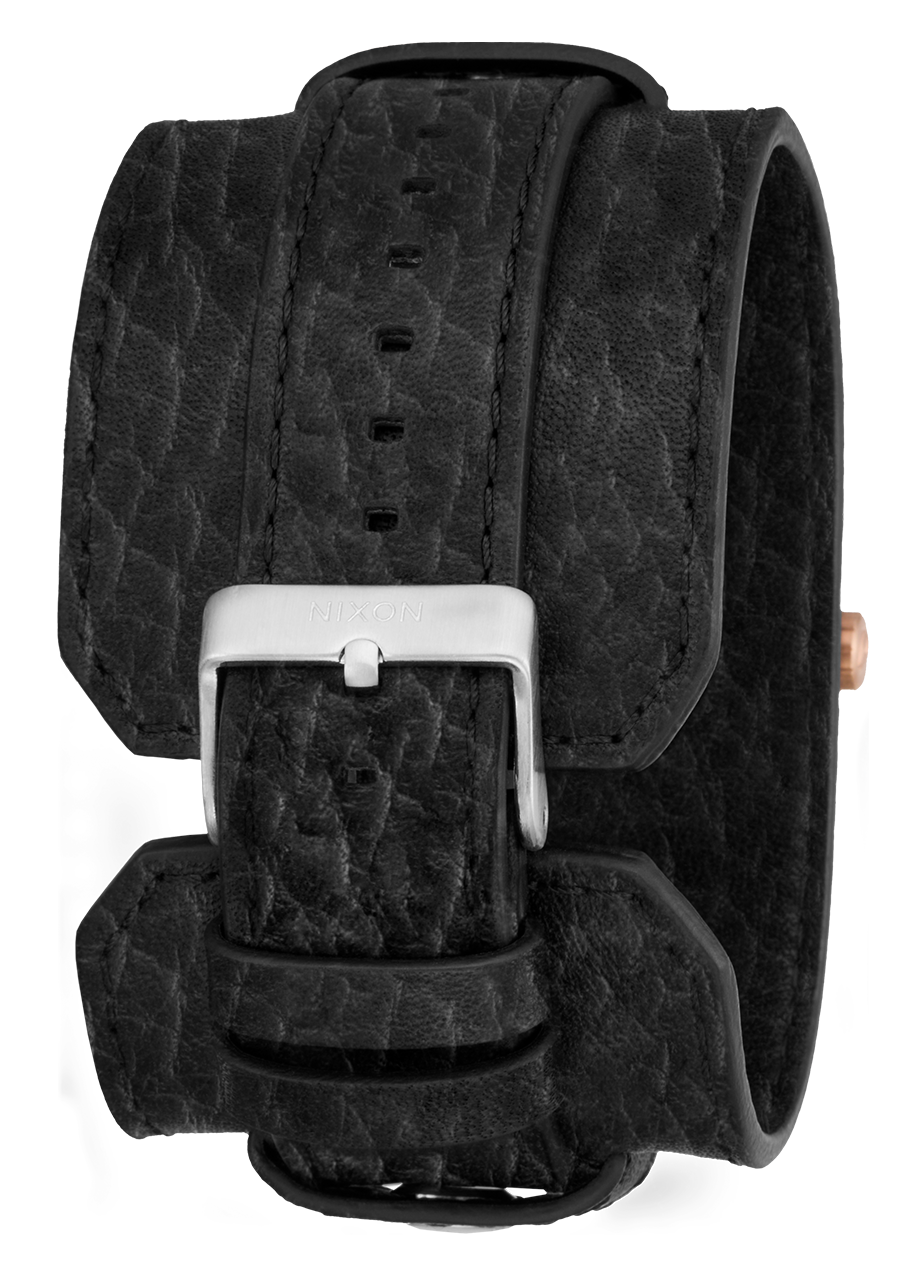 20mm genuine leather quick release watch strap with solid stainless steel buckle. 45mm custom genuine leather rocker band with Nixon logo and stainless steel rivets. Bands can be separated to create two different looks.