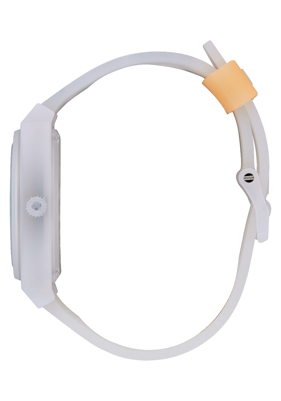 40mm custom stainless steel core case with a 100 meter / 10 ATM water rating. Watch case is encased in custom injection molded polycarbonate, fixed polycarbonate bezel, hardened mineral crystal, triple gasket molded polycarbonate crown, screw down stainless steel caseback encased in custom injection molded polycarbonate and stainless steel spring pin lugs.
