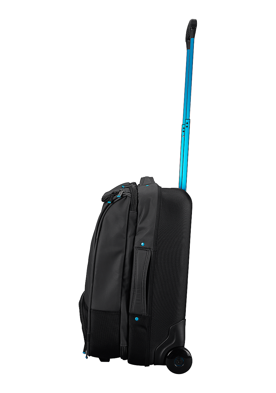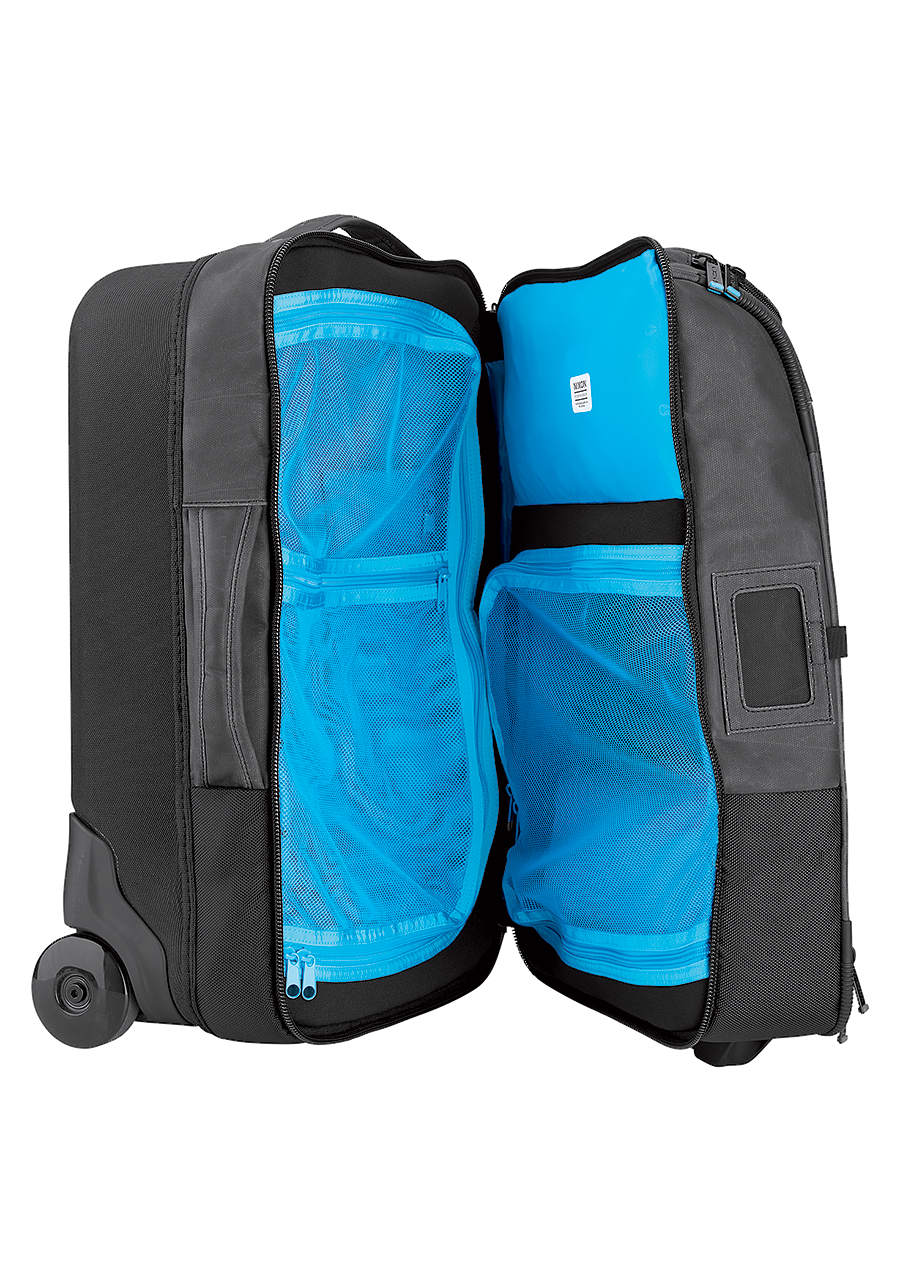 Carry-on, split level roller bag. Exterior organizer pockets, lockable main zipper. Custom retractable handle. Urethane skate wheels